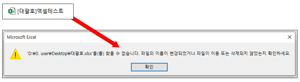 최근(2025년) 마이크로소프트의 업데이트 이후 엑셀 파일 제목에 대괄호 [ ]가 포함된 경우 동일한 오류가 발생하는 현상이 확인되었습니다.